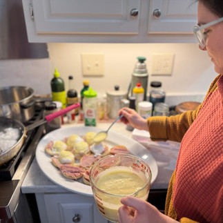 CONFESSION: In fear of the command performance, I googled Martha Stewart and Ina Garten in the wee small hours of Christmas Eve. I've got the ratio down now. It's a 1/4 cup of butter per egg yolk. Just need to taste for salt, acid, and heat after blending.